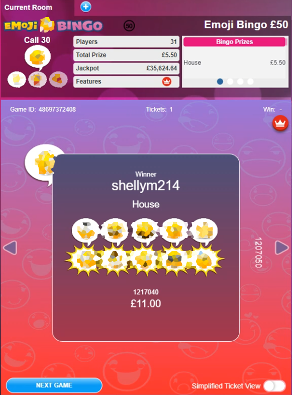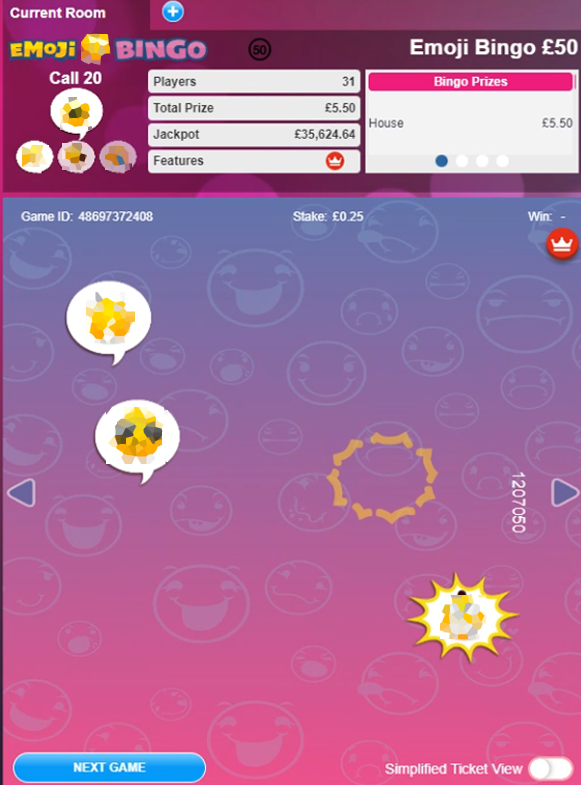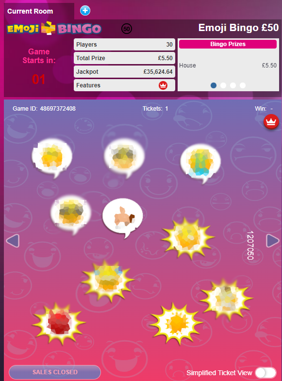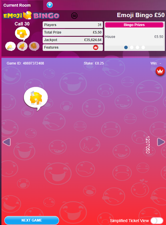 This game is played for a full house prize only, so the first player to match all 10 emojis wins. The room is open from 7 am until 3 am daily and tickets start from 10 – 25p each depending on the time of day. This is a multi-stake game, meaning you can take part regardless of your budget with the most expensive tickets costing £2.50.