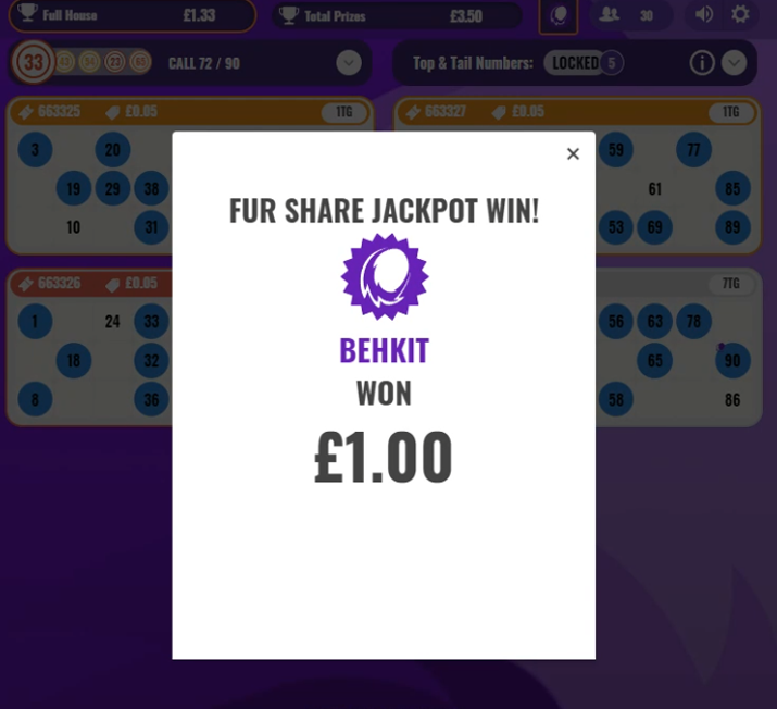 The Fur Share jackpot can be won if someone gets a full house on a number that you choose as part of your Tops and Tails lucky numbers. Now, this jackpot isn’t the largest you will find and varies from game to game. When we reviewed the site, the smallest jackpot was £1 and the largest was £20. In general, you will find the more expensive tickets feature the largest Fur Share Jackpots.