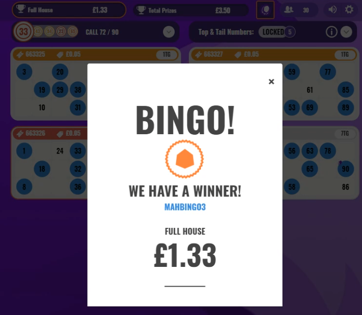 The game then plays as usual, with players getting prizes for 1-line, 2-line and a full house.
