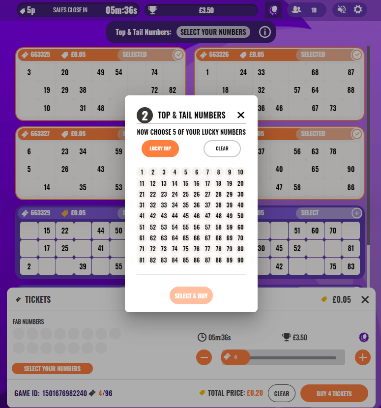 On the ticket selection screen, you can purchase up to 96 tickets. You will then be asked to choose 5 ‘Tops and Tails’ numbers. You can either tap on your chosen numbers manually or if you can’t decide you can opt for a lucky dip. These 5 numbers will be marked with a fox’s tail on your ticket.