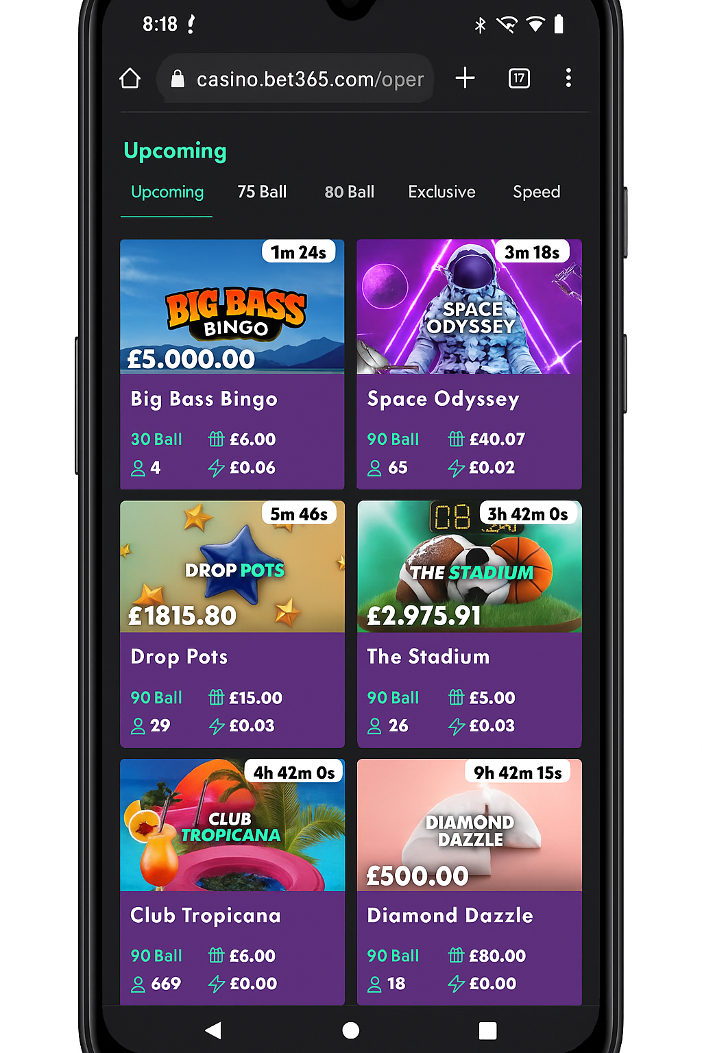 • Variety of Games: Bet365 Bingo offers an impressive range of bingo games, with options like 90 Ball, 50 Ball, and 30 Ball Bingo to keep things exciting.